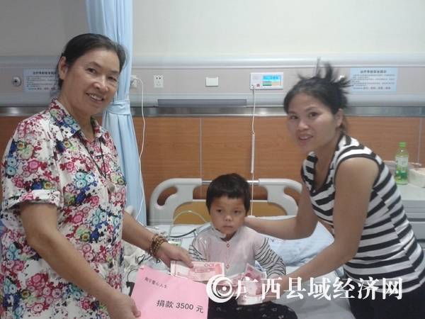 7月上旬,南宁市第二人民医院心胸外科黄洪医生给我会常务副秘书长杨丽英打电话,说有一个4岁多的先天性心胸病患儿,病情比较严重,手术治疗费需要6万多元,但家庭很贫困,家里只借得2万多元,向红十字会申请可能得资助1万元,仍缺3万元人民币治疗款,急需帮助,希望我会常务副秘书长杨丽英给予想办法,杨丽英副秘书长接电话后立即到医院看望病儿和了解病情,并及时将情况向香港慈善机构众善堂有限公司慈善家龙凤翔老师、潘锭钊先生通报情况,请求他们伸出援手,帮帮这个贫困家庭患儿。香港慈善机构众善堂立即召开会议同意捐款救治,并在接到信息的第三天就将37419元港币善款转到南宁第二人民医院。速度之快的善举和爱心让我们非常感动。