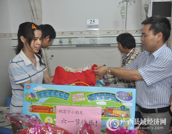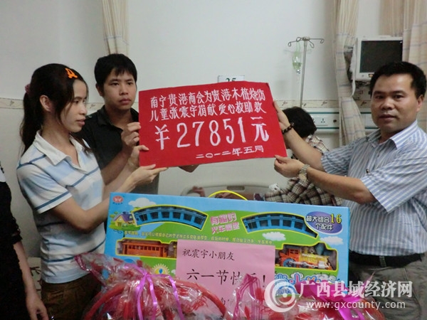 5月31日下午,在六一儿童节前夕,南宁贵港商会到广西医科大一附院探望了严重烧伤的张震宇小朋友,并送去65人捐赠的27851元善款和节日礼物。爱心不分大小,促进会同仁也表表心意,促进会常务副秘书长杨丽英、办公室主任廖燕妮、县域网的黄彦凝、曹冰同事以及朋友等人积极参与,共捐款2750元和二瓶营养品,代表所有关心小震宇的朋友祝小震宇早日康复,六一国际儿童节快乐!