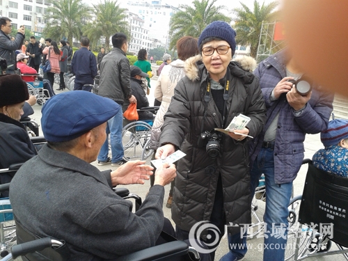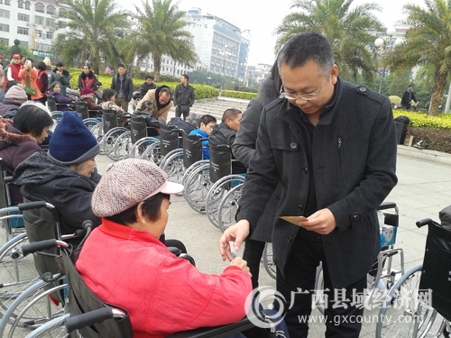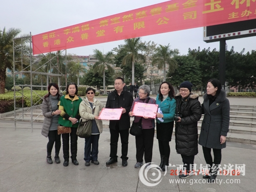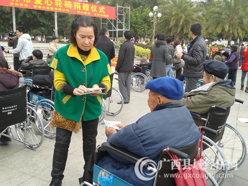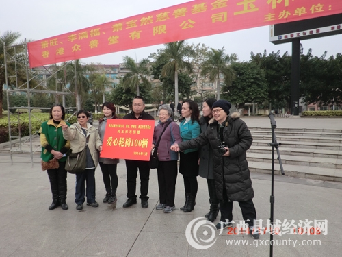 本次活动是由广西县域科学发展促进会牵线,香港众善堂有限公司筹款、协助香港萧旺、李满福、萧宝然慈善基金第一次向玉林市捐赠爱心轮椅活动。来自香港的澳大利亚华人慈善家龙凤翔老师、澳大利亚华人爱心人士邓妙云女士、香港爱心人士陈诗珊女士、徐秀莲小姐一行4人在广西县域科学发展促进会常务副秘书长杨丽英的陪同下,出席捐赠仪式并代表香港萧旺、李满福、萧宝然慈善基金向玉林市100名贫困残疾朋友每人捐赠一部轮椅和交通费50元以及外用药油等纪念品。
