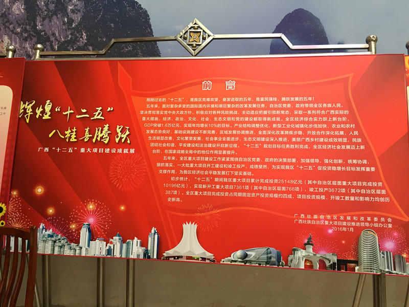 为鼓舞人心、凝聚信心、形成合力,强化重大项目建设的良好氛围,自治区发改委重大处牵头制作了“十二五”重大项目建设成就展板,在1月24日至29日召开的自治区“两会”期间展出,向全区人大代表全面展示了我区“十二五”重大项目建设的丰硕成果。本次“十二五”重大项目建设成就展板由广西县域科学发展促进会协助重大处制作。