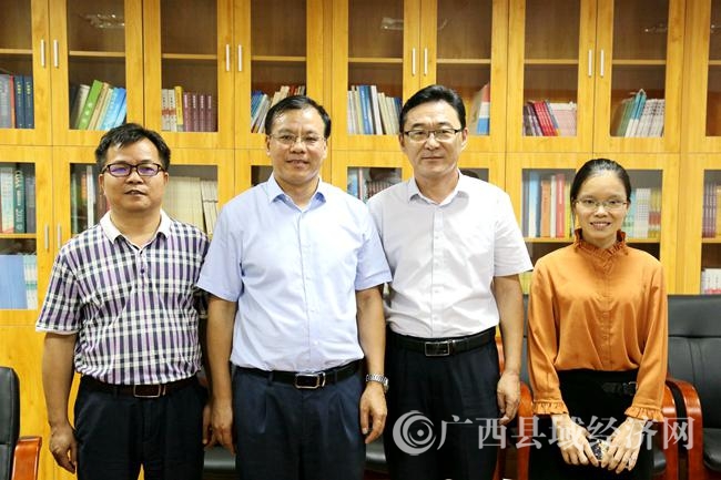 广西县促会副会长兼秘书长黄品优(左二)、副秘书长罗福坚(左一)与来访的北京中农富通园艺有限公司广西分公司总经理韩雪松(右二)、总经理助理周静华(右一)合影。