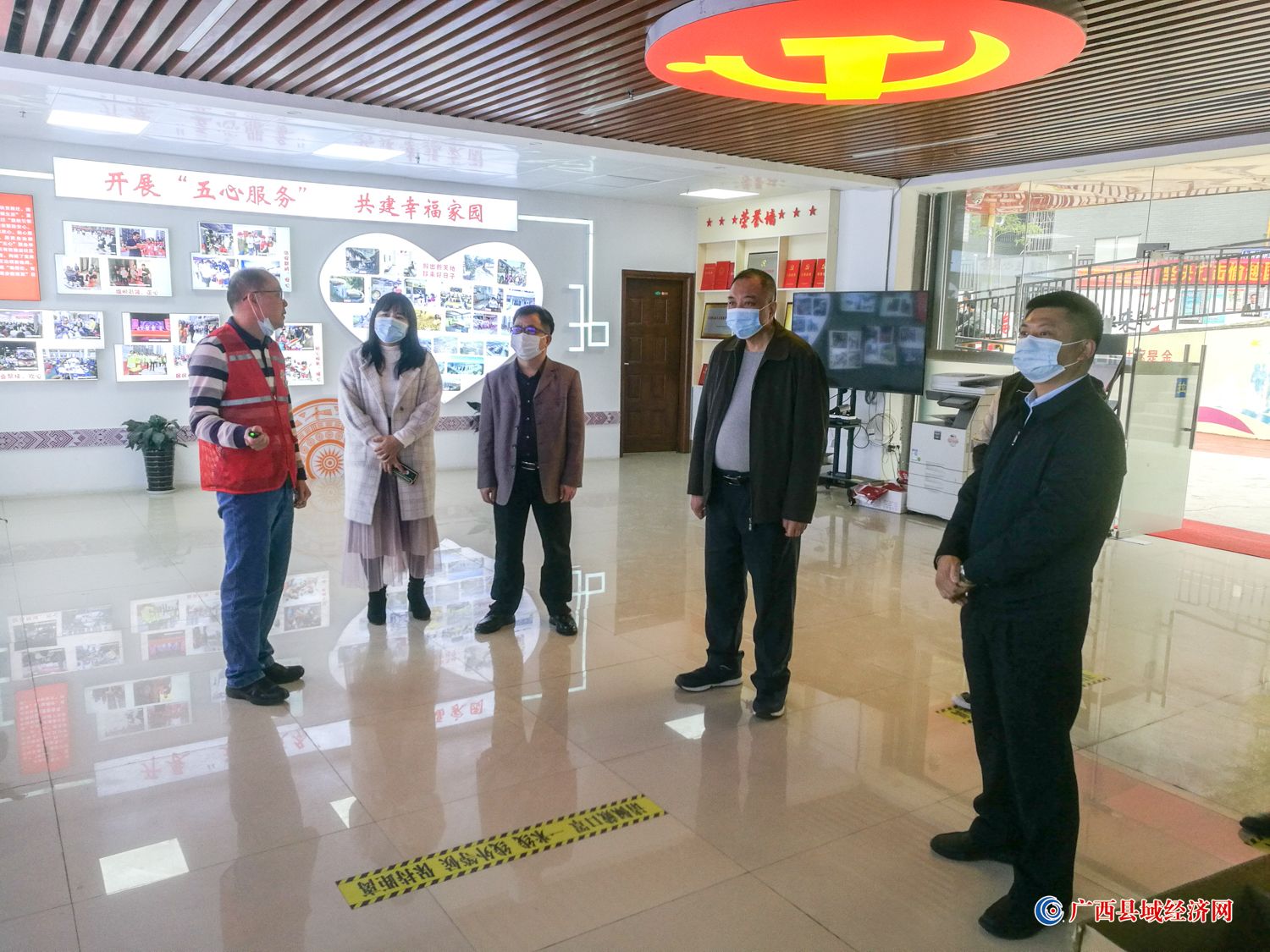 隆安县人大常委员会副主任潘健(右一)及相关部门领导陪同调研组在震东安置区服务站调研