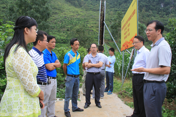 9月24日,黄品优(右一)带队在靖西南坡乡高山脐橙基地考察,靖西县常务副县长陆保亿(右二陪同。