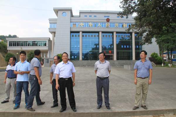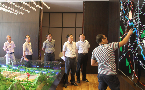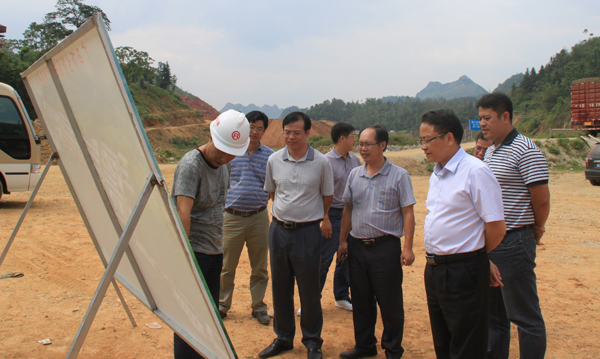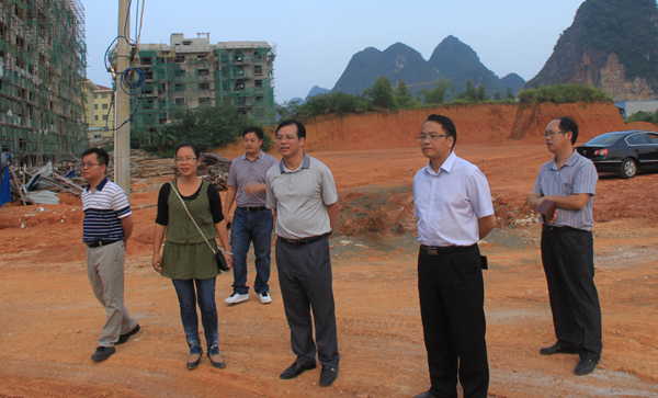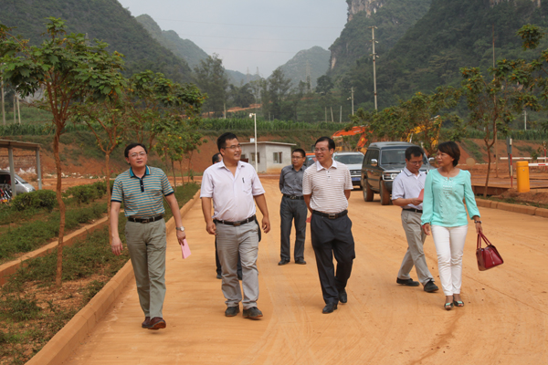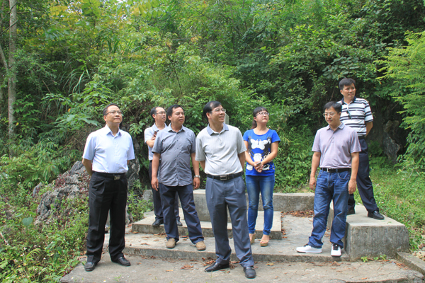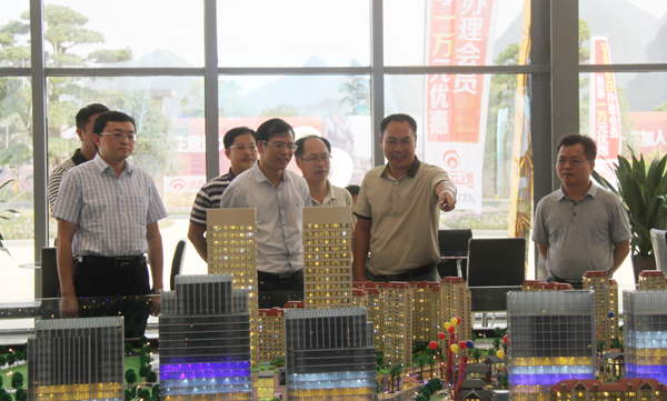 9月24日,黄品优(右四)带队考察靖西旧州景区开发项目,靖西县常务副县长陆保亿(右一)、靖西县发改局局长朱宇(左三)陪同。