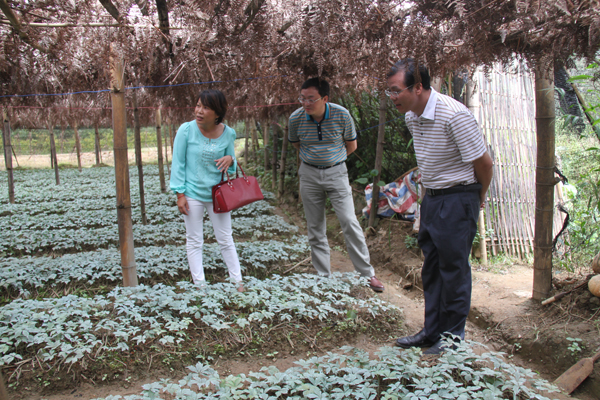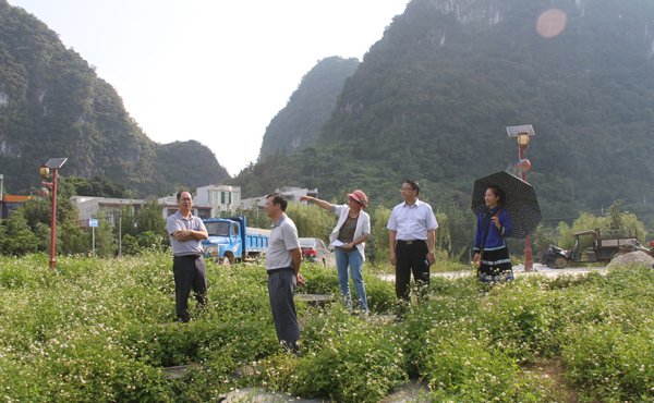 9月25日,黄品优(右)带队考察靖西禄峒田七种植基地,靖西县委副书记杨世爵(中)陪同。