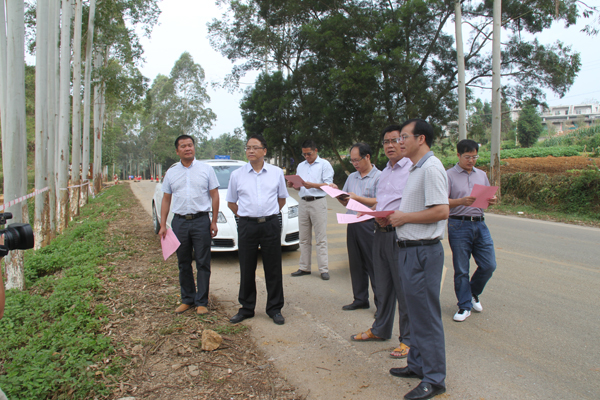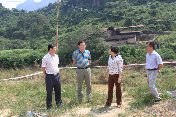 9月25日,黄品优(右一)带队考察靖西湖润镇河道改造、污水处理项目,靖西县委副书记杨世爵(左二)陪同。