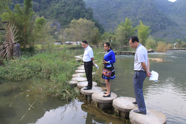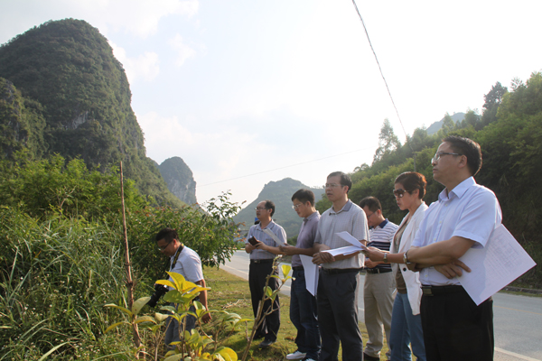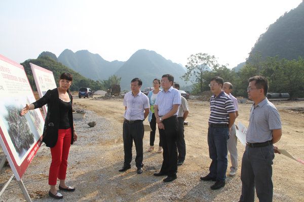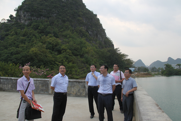 9月23日,黄品优(右三)带队在靖西湿地公园考察,靖西县委副书记杨世爵(左三)、常务副县长陆保亿(左二)陪同。