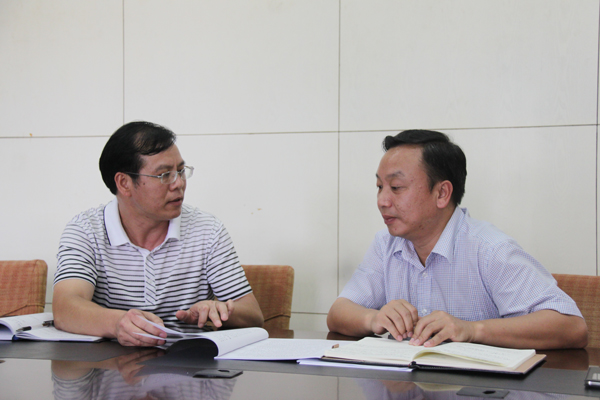 9月26日,黄品优(左)与靖西副县长方业松(右)交谈。
