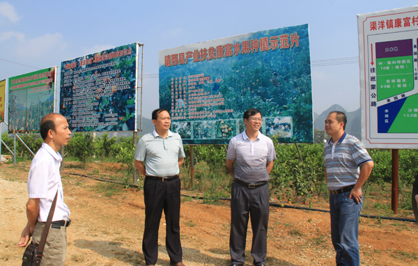 9月26日,黄品优(右二)带队考察靖西渠洋镇康富种养殖合作社水果基地,靖西县委副书记陆伟(左二)陪同。