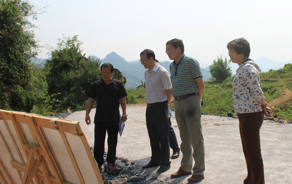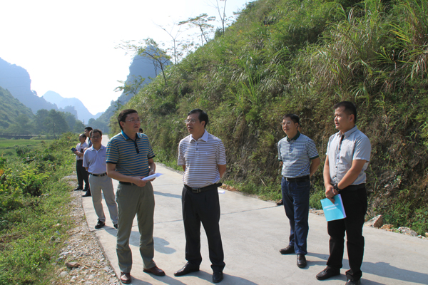 9月24日,黄品优(中)带队在靖西吞盘乡575号国界碑考察,靖西县常务副县长陆保亿(左一)、靖西县发改局局长朱宇(右二)陪同。