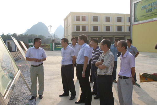 9月23日,黄品优(左二)带队在鼎香(靖西)农批大市场考察,靖西县委副书记杨世爵(左四)、靖西县发改局局长朱宇(左五)陪同。