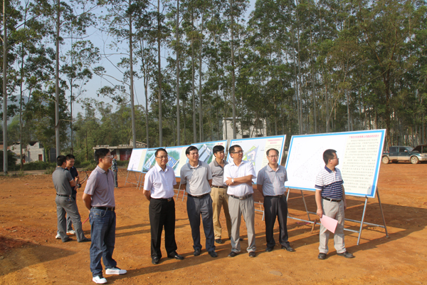 9月23日,黄品优(左二)带队在靖西乡球文化主题公园考察,靖西县委副书记杨世爵(左四)、靖西县发改局局长朱宇(右三)陪同。