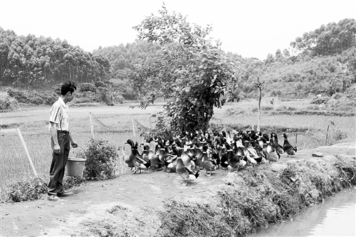 农户正在给饲养的土鸭喂食。