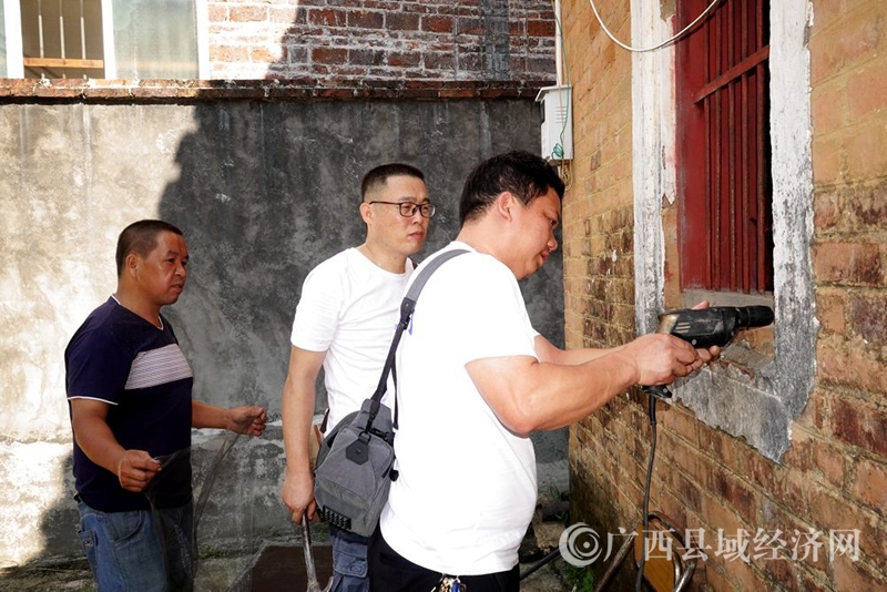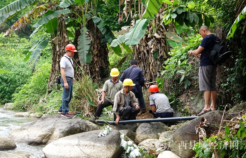 恭城县水利局工作人员到东寨村指导工作维修饮水管(通讯员黄晓君摄)