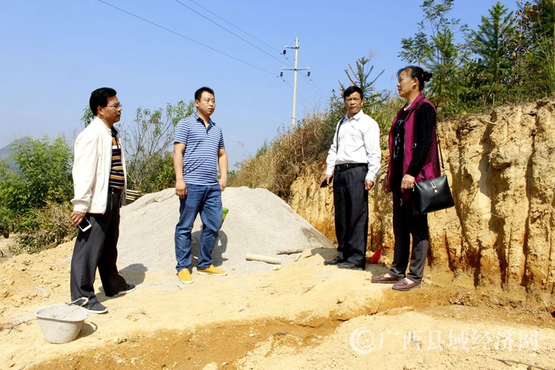 恭城县水利局领导和工作人员在东寨村指导该村基础设施建设(通讯员黄晓君摄)