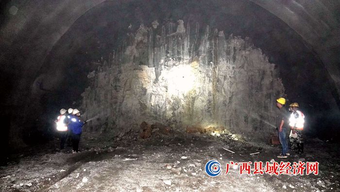 施工人员在查看贵南高铁广西段九万大山三号隧道即将爆破的掌子面。