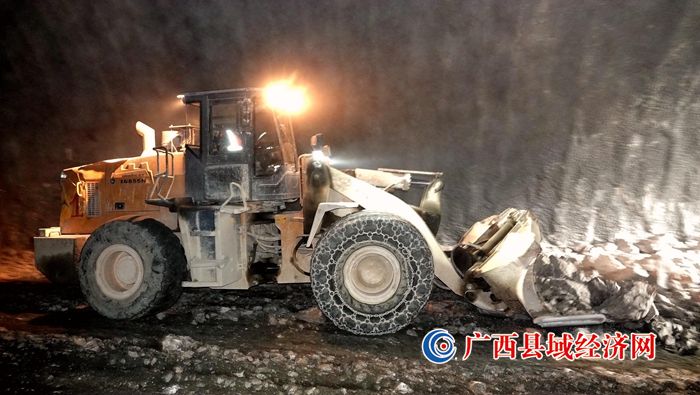 施工车辆在清理贵南高铁广西段九万大山三号隧道碎石。