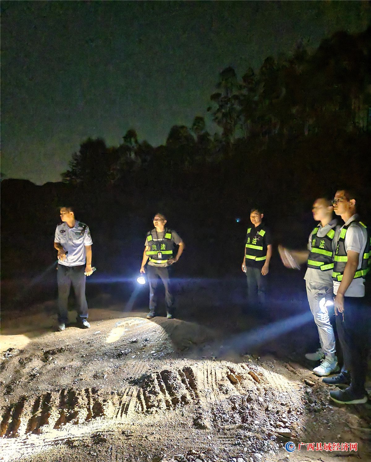 图为亭亮镇工作人员正在开展非法采矿巡逻工作