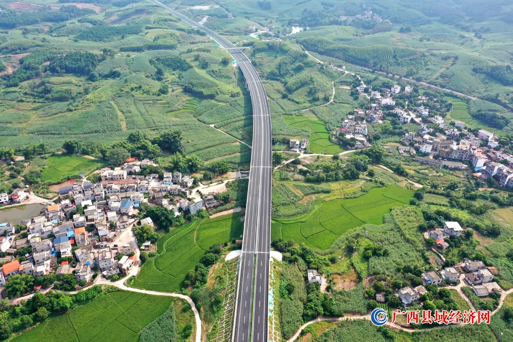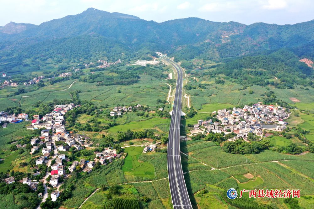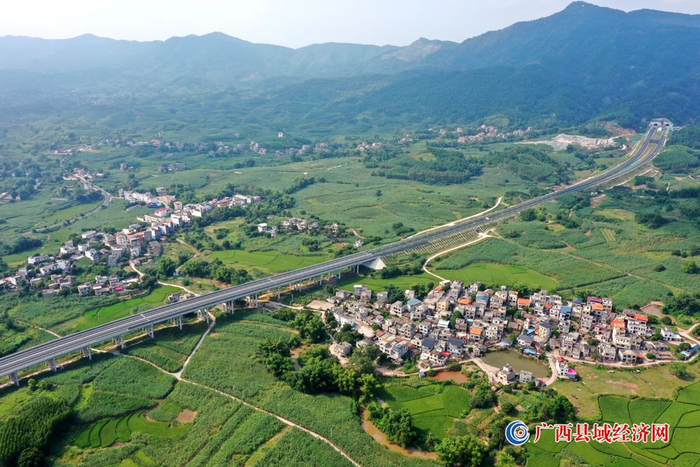 图一、10月6日,空中俯瞰下的广西宁明县峙浪乡长桥村美丽田园与穿境而过的崇爱高速公路交相辉映、美轮美奂。 (周贻刚 摄)
