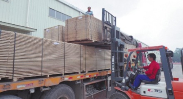 为工人正在将胶合板产品装车外运。