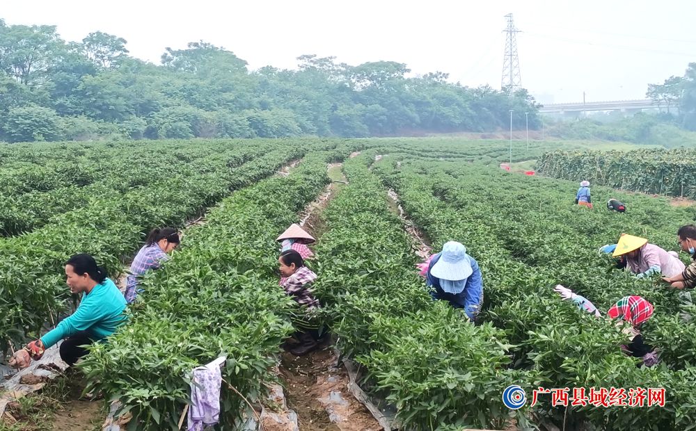 图二、4月21日,宁明县明江镇安马村菜农正在菜地里采摘丰收的成熟菜椒。 (梁文高 摄)
