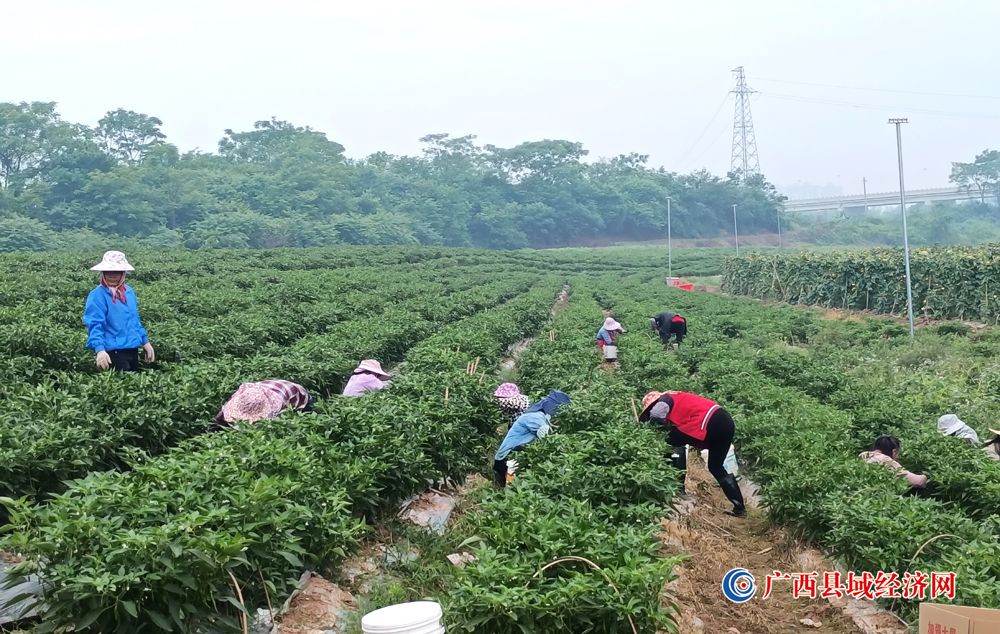 图一、4月21日,宁明县明江镇安马村菜农正在菜地里采摘丰收的成熟菜椒。 (梁文高 摄)