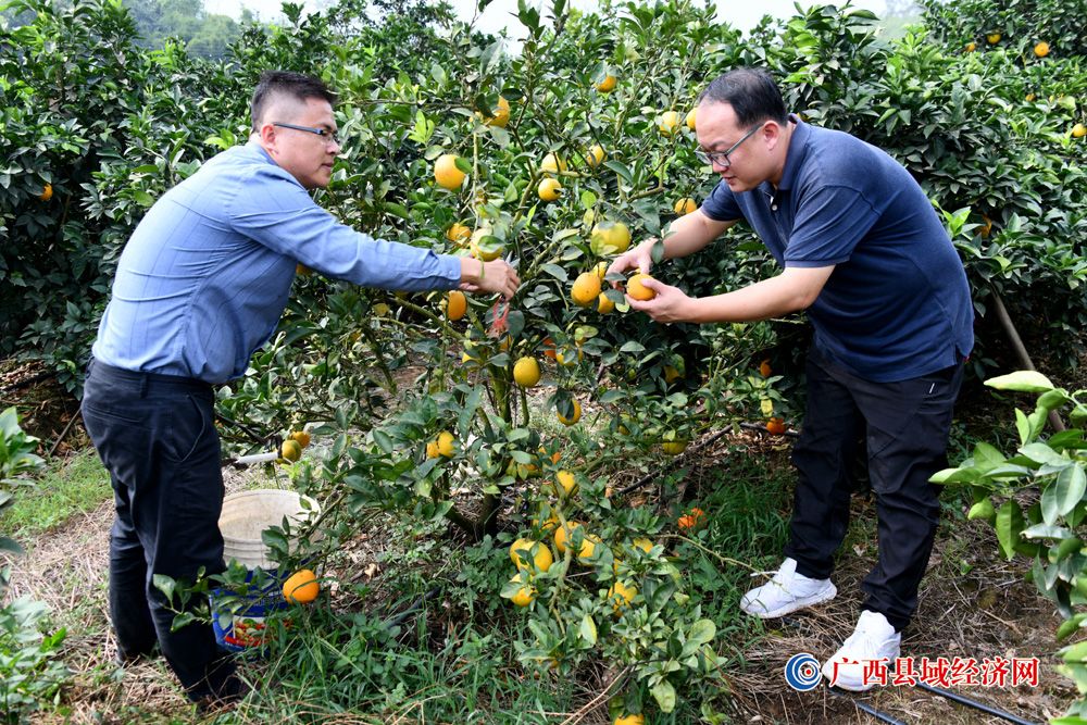 图六、11月16日,广西宁明县橙香果业专业合作社脐橙园里两位游客正在体验采摘脐橙的乐趣。(周贻刚 摄)