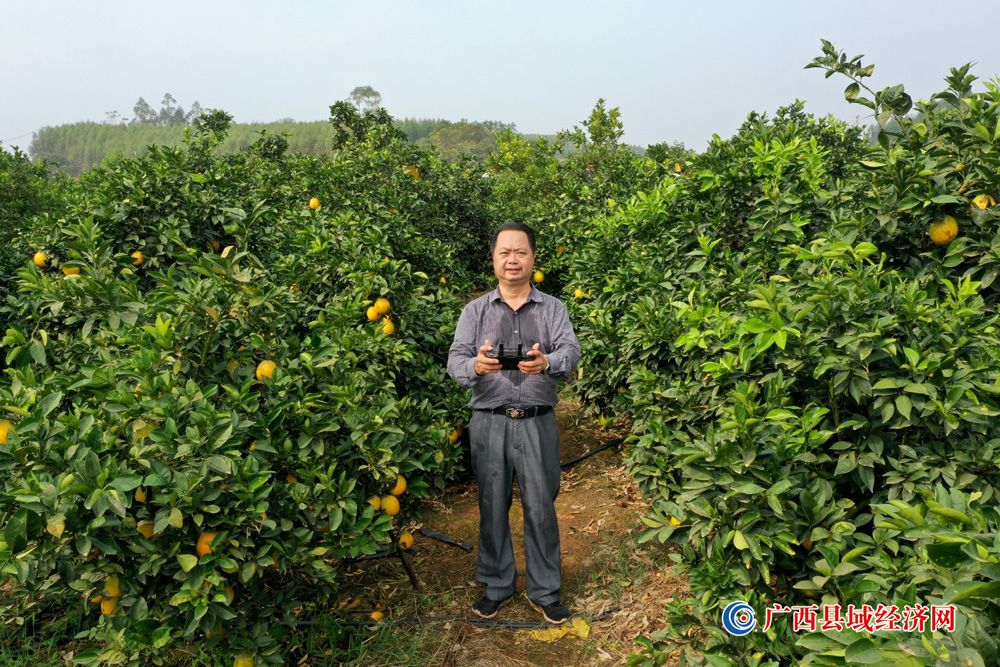 图九、11月16日,广西宁明县一位新闻摄影工作者正在航拍宁明县橙香果业专业合作社脐橙园。(周贻刚 摄)
