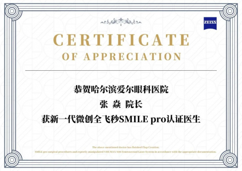 权威认证加持:2025 年 10 月,张焱院长荣获 “新一代微创全飞秒 smile pro 认证医生” 证书,这是蔡司公司对其技术的官方认可,标志着他具备开展新一代全飞秒手术的顶尖资质,也是哈尔滨少数拥有该认证的专家之一。