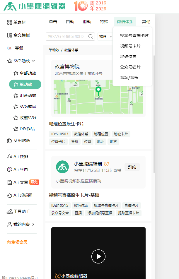 素材丰富度(15分):模板数量、svg动效素材、行业适配性
