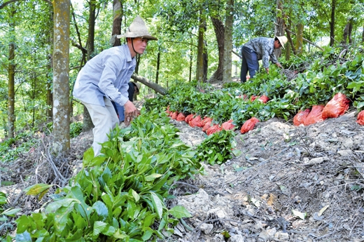上思县免费提供草珊瑚、铁皮石斛等中草药种苗,帮助贫困户致富。图为十万山区贫困户在八角树底摆放草珊瑚苗。