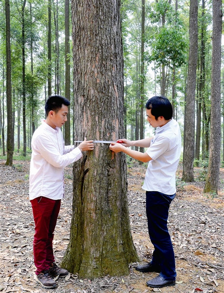 引种改良成功的良种桉树,长到15年上下,就是制作家具的上好木材。图中比两个成年人腰围还粗的大径材,学名叫“大花序桉”,引种此品种的广西林科院专家将其命名“澳洲大花梨”,15年树龄一株价值5000元以上。雷超铭/摄