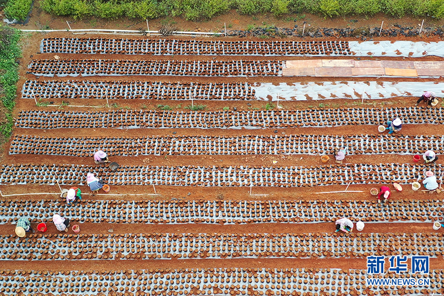 无人机航拍农户们在中华茉莉园培育茉莉花苗。新华网 刘君摄