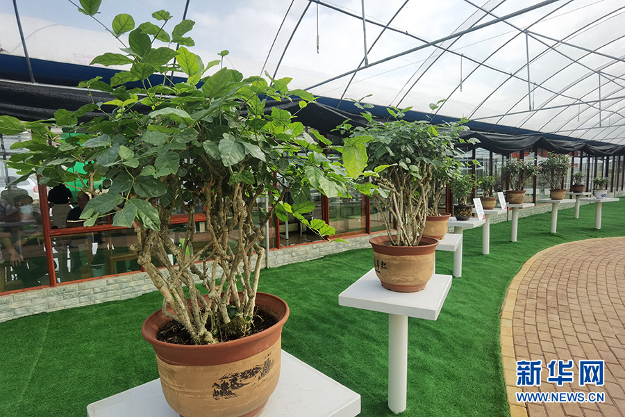 横县校椅镇榃汶村茉莉花盆栽和蔬菜育苗扶贫示范园内展示的茉莉花盆栽。新华网 刘君摄
