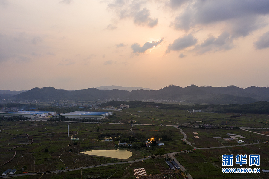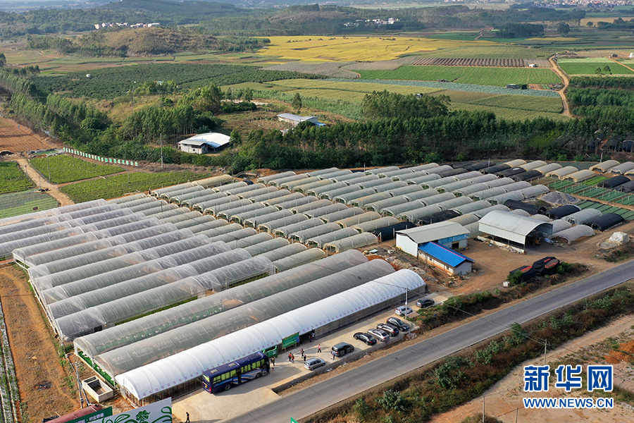 无人机航拍的横县校椅镇榃汶村茉莉花盆栽和蔬菜育苗扶贫示范园。新华网 刘君摄