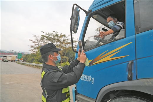 友谊关口岸待放行货场车辆智能调度系统上线后,工作人员对抵达核验点的车辆进行扫码放行。