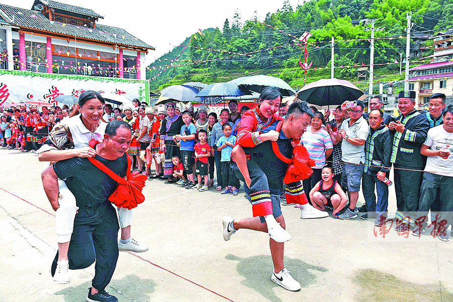 6月14日,龙胜马堤乡里市村举行一年一度的“姑娘节”,苗族同胞开展背媳妇等民俗活动。 吴生斌 张水秀摄