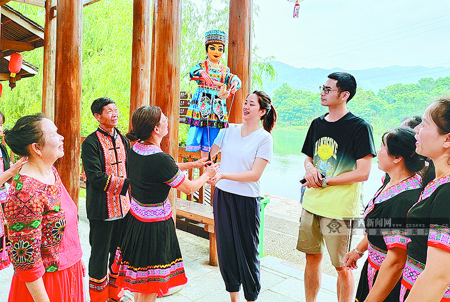 假期里,在恭城龙虎古镇,当地的传统木偶表演吸引游客驻足观赏。周品秋 黄若梅摄