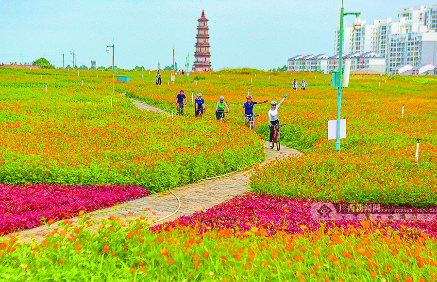假期里,合浦县海丝文化遗址公园内的硫华菊绽放,吸引游客前来观赏。林启波摄