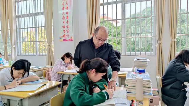 广东省台山市华侨中学选派到天等县高级中学支教的教师龙超洪,举家搬迁落户大石山区天等县。图为龙超洪老师正在给天等高中学生上课辅导。
