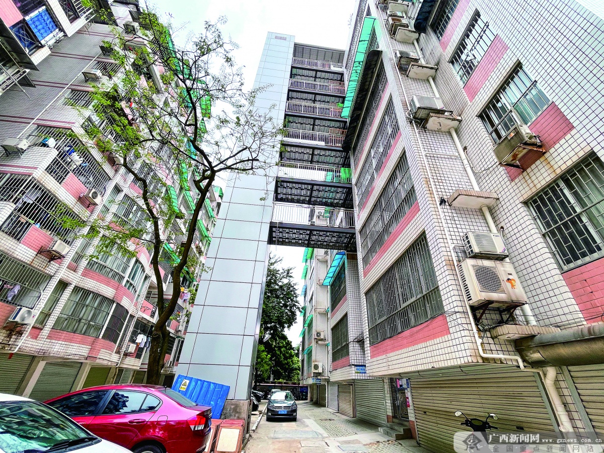 南宁市东宝路附近一小区,加装的电梯从4楼开始用廊道与楼房相连。记者 邹财麟 摄