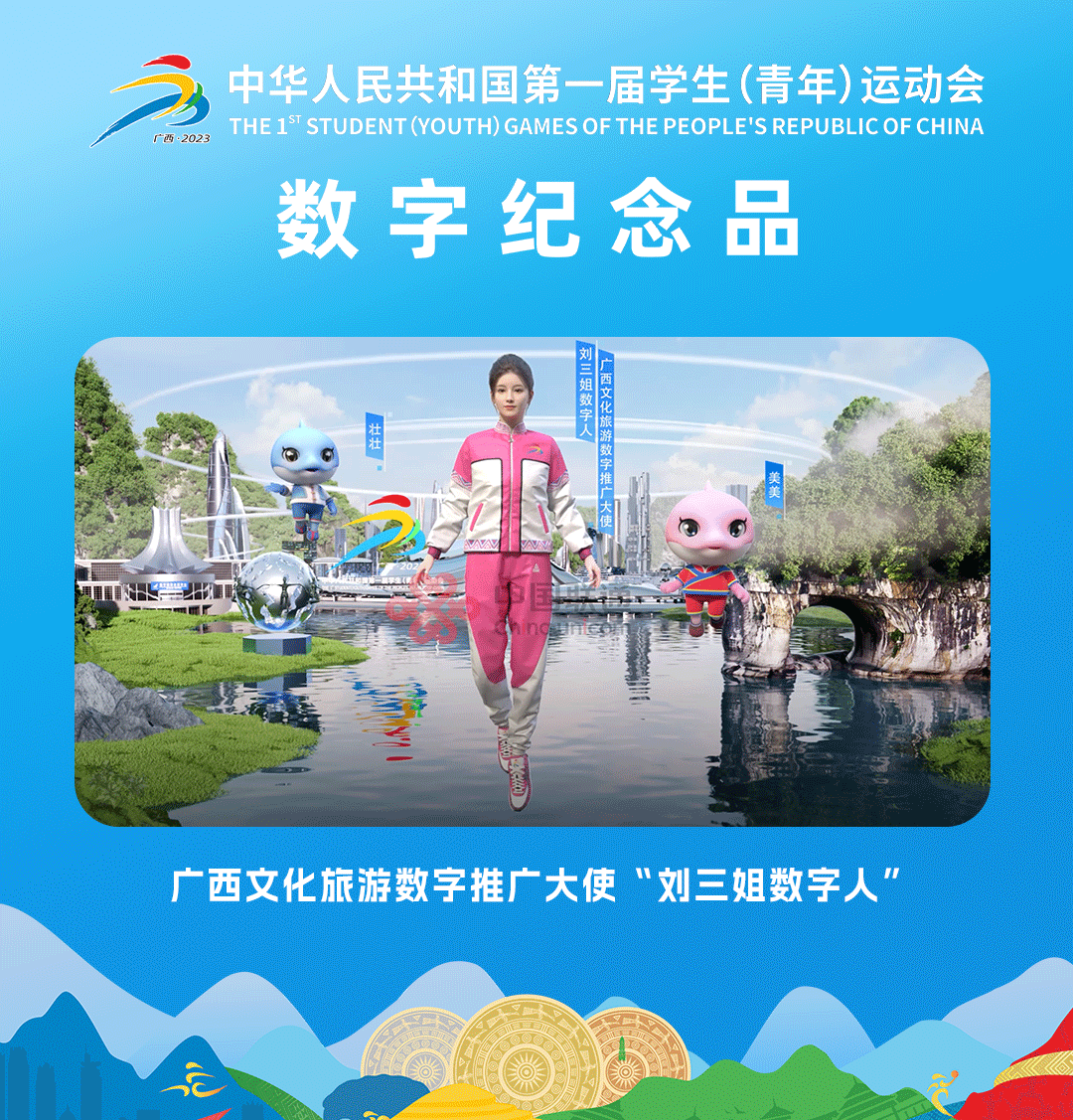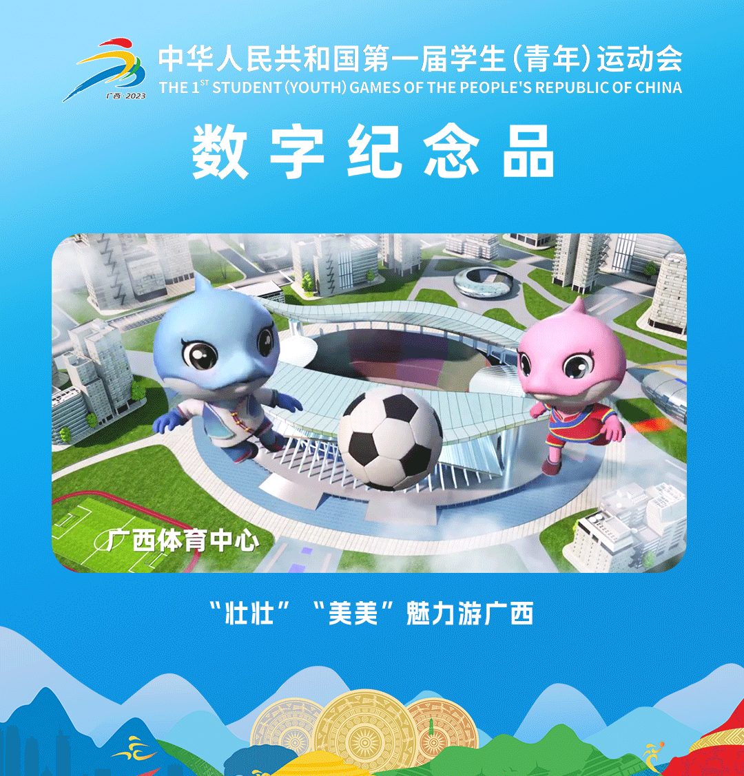 在此番的数字藏品中,设计团队以学青会会徽、吉祥物“壮壮”“美美”、广西文化旅游数字推广大使“刘三姐数字人”为灵感,融合广西文旅、标志建筑与学青会元素,通过数字化探索和创新,用数字赋能“智慧学青会”。