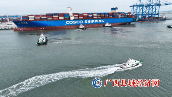 11月14日,15万吨级集装箱船舶“中海金星”轮在钦州保税港区海事处“海巡10252”船监护下顺利进港,稳稳地靠泊在钦州自动化集装箱码头。这是“中海金星”轮今年第4次进靠钦州港。实现超大型集装箱船舶常态化靠泊是钦州港打造国际枢纽海港迈出的重要一步,将为西部陆海新通道建设开启“加速度”模式。