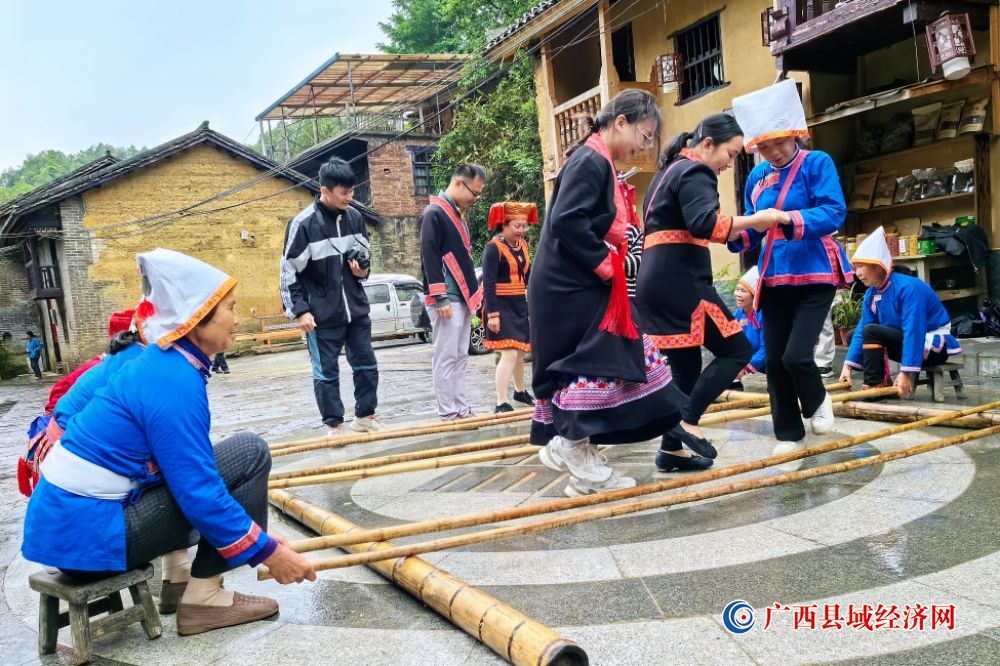 游客在金秀县六段村里跳竹竿舞。王扬 摄