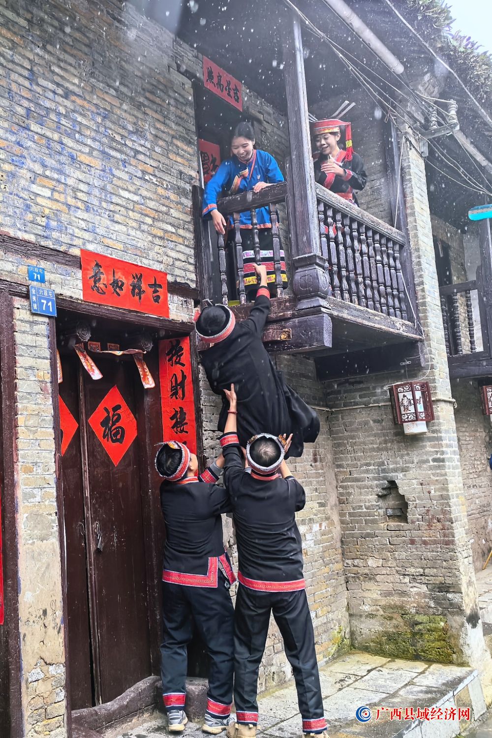 金秀县六段村里在表演民俗“爬楼”。王扬 摄