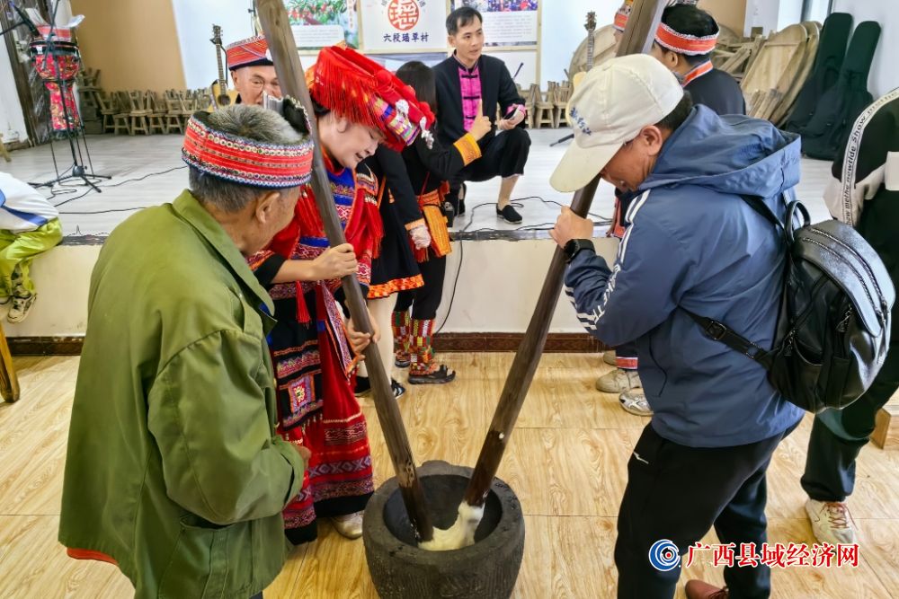 游客在金秀县六段村里体验舂糍粑。王扬 摄