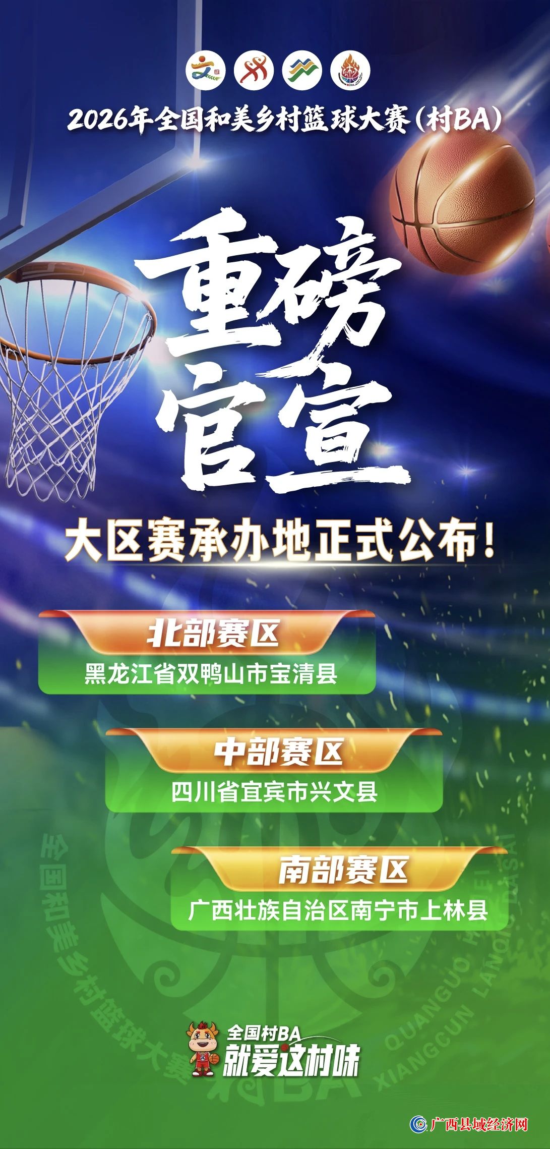 2026年全国和美乡村篮球大赛(村ba)大区赛落地黑龙江省双鸭山市宝清县、四川省宜宾市兴文县、广西南宁市上林县三地。这场全民期待的乡村篮球盛宴,既是各地球员切磋球技的竞技舞台,更是融合山水风光、民俗风情、特色美食的文旅嘉年华,而广西南宁市上林县凭借“世界长寿之乡”的独特底蕴,成为本次赛事南部赛区的亮眼名片,邀八方宾朋共赴山水之约,感受篮球与壮乡风情的碰撞。