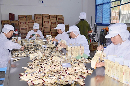 西林县一家工厂的工人正在车间包装姜晶。