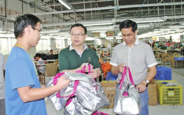 北流市市长招展(中)在万晖运动袋公司调研。