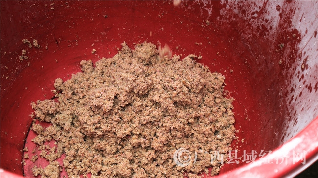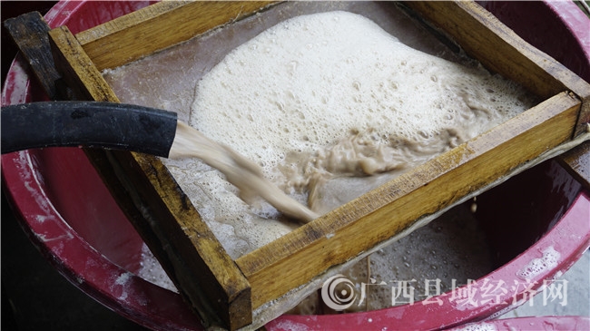 凌云人制作红薯粉,产品需要经过清洗、打浆、过滤、蒸煮、切丝、晾晒、包装等工序,原料为红薯和山茶油。